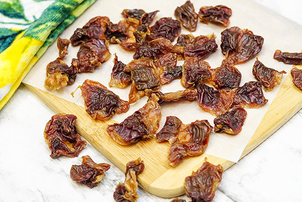 Our dehydrated chicken gizzards dog treats are made from 1 single ingredient, all natural chicken gizzards with no fillers, preservatives, or artificial ingredients. Air dried at low temperatures to maintain nutrients and taste. A great high value, healthy protein treat that is a natural source of glucosamine can be used for training or just because they're a good boy or girl. We hand trim any visible fat. 100% safe treat made here in the USA. A perfect high value treat for dogs with allergies, overweight, sensitive tummies and seniors. Great for teeth and gum health. Makes a great training treat or food topper. Chewable- not hard. Tastes great, your pet will be begging for more!