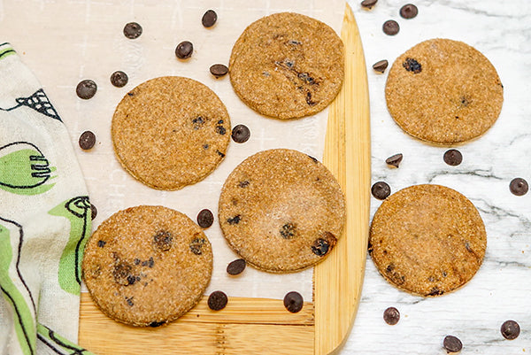 Who doesn't love chocolate chip cookies??! Now we have our version for dogs! We use dog safe carob chips to make our tasty dog treat cookies. The perfect dog gift for any puppy party! Made with human ingredients. A treat you can share with your dog.