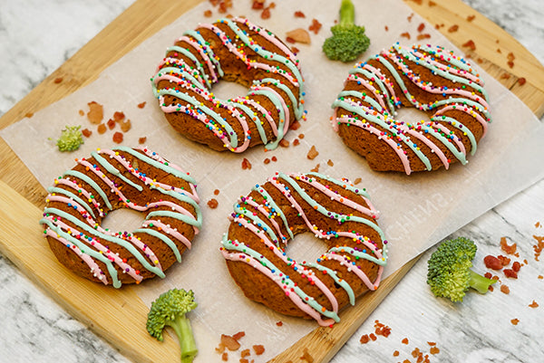 Our Broccoli and Peanut Butter doggy donuts are the perfect delicious & healthy treat for your pup! They won’t even know you snuck in some veggies.